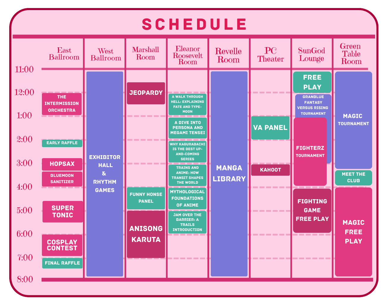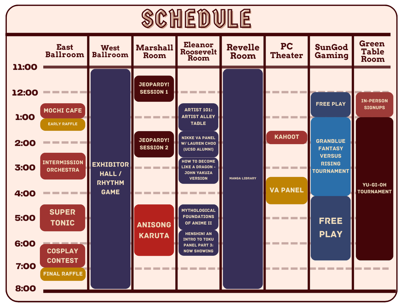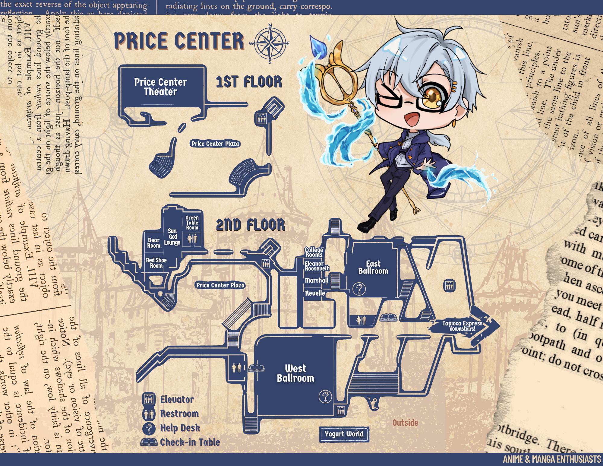 Animefest is held at the Price Center at UC San Diego. Specifically, it will be at the West Ballroom, East Ballroom, Thurgood Marshall, Eleanor Roosevelt, Roger Revelle, Theater, Red Shoe, Bear, and Green Table rooms.